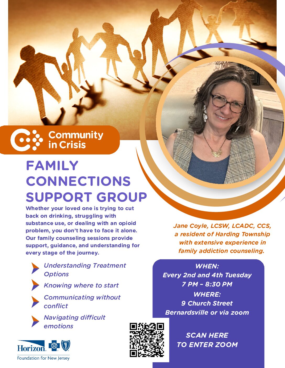 The group will be led by Jane Coyle, LCSW, LCADC, CCS, a resident of Harding Township with extensive experience in family addiction counseling.