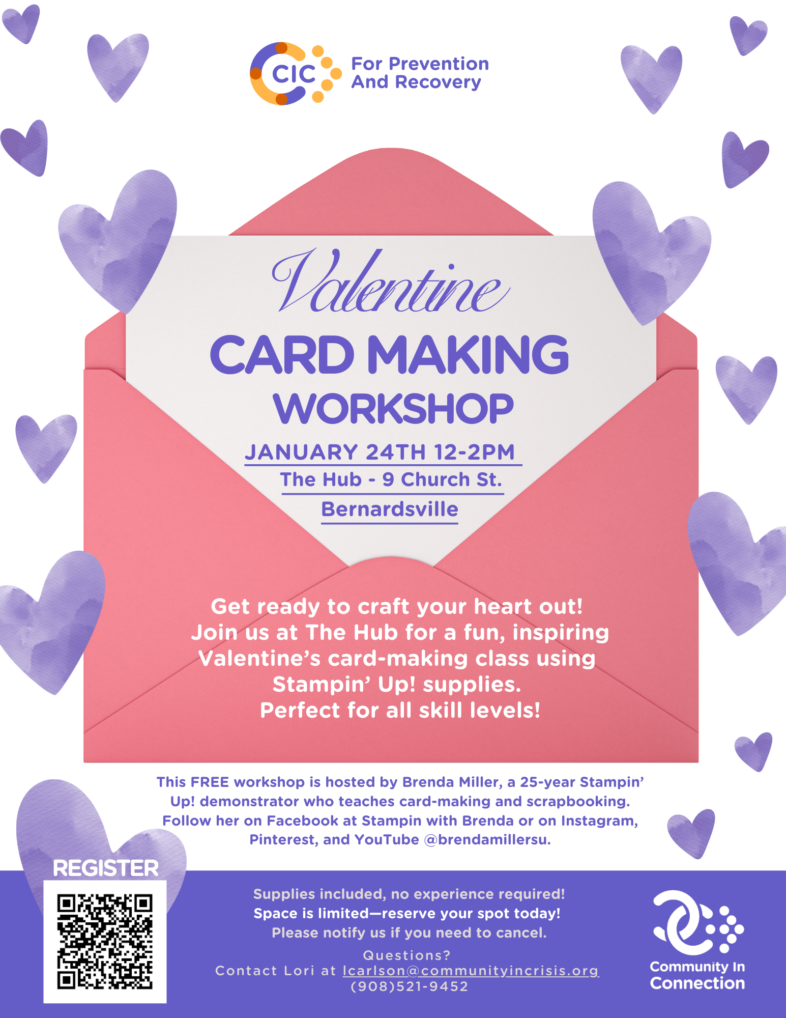 Get ready to craft your heart out! Join us at The Hub for a fun, inspiring Valentine’s card-making class using Stampin’ Up! supplies. Perfect for all skill levels! This FREE workshop is hosted by Brenda Miller, a 25-year Stampin’ Up! demonstrator who teaches card-making and scrapbooking. Follow her on Facebook at Stampin with Brenda or on Instagram, Pinterest, and YouTube @brendamillersu.