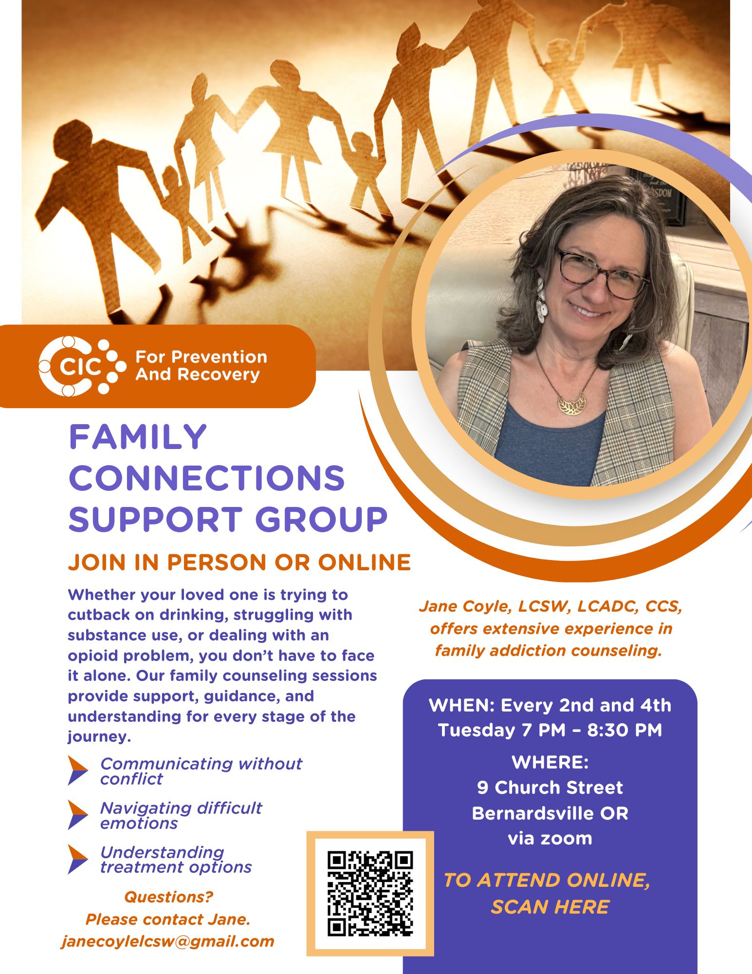 The group will be led by Jane Coyle, LCSW, LCADC, CCS, a counselor with extensive experience in family addiction.